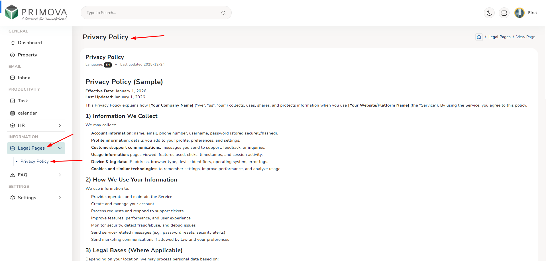 - Knowledge Base: Access legal pages and FAQ resources (view-only)