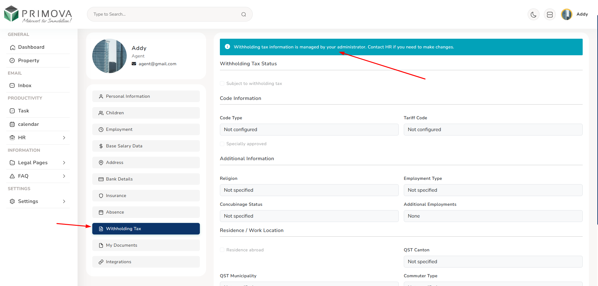 - Withholding Tax: Tax status, code information, residence details